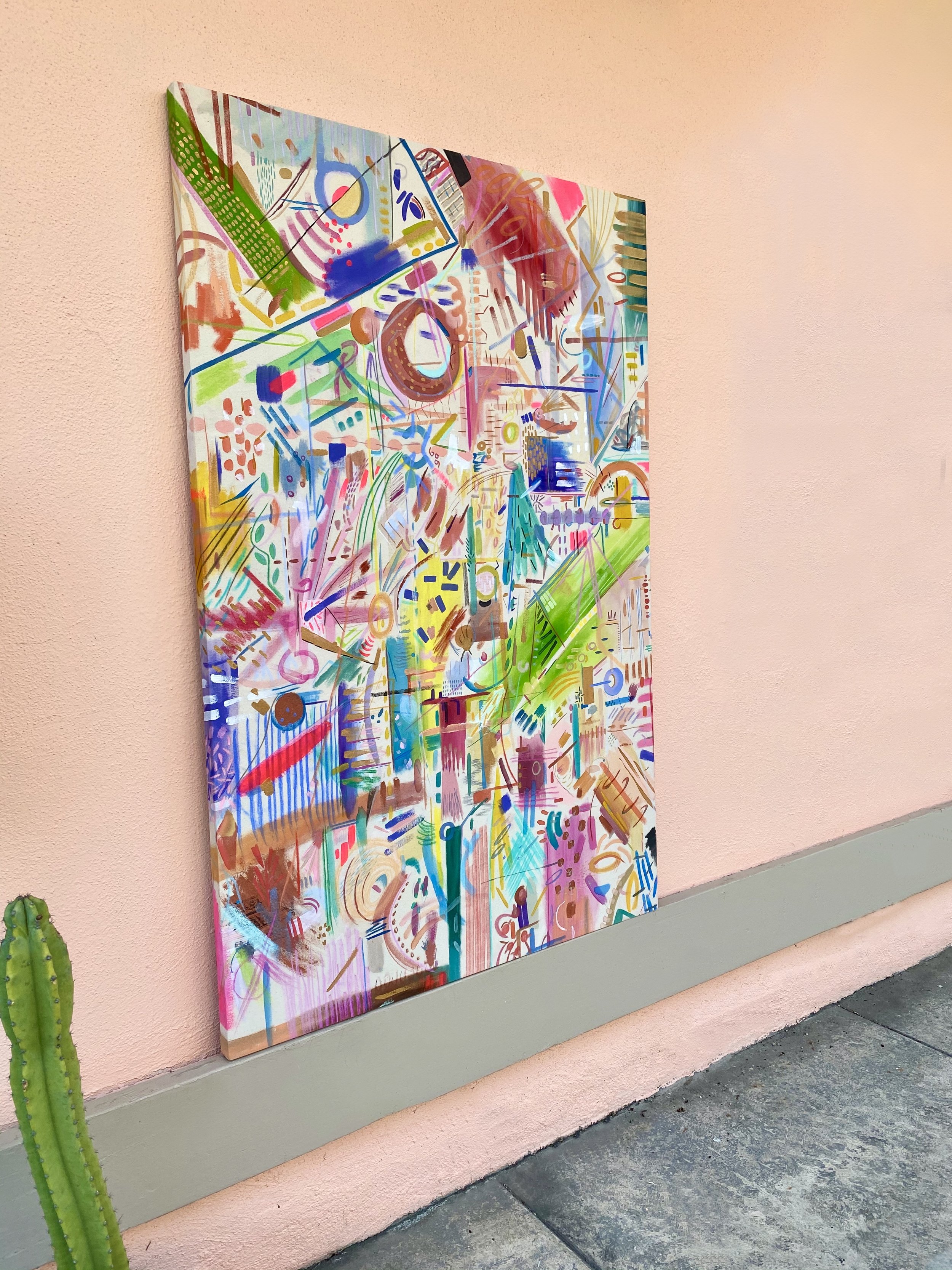 A collection of abstract paintings, emerging from uncertain times. Escaping into excess for relief joy comfort & connection.