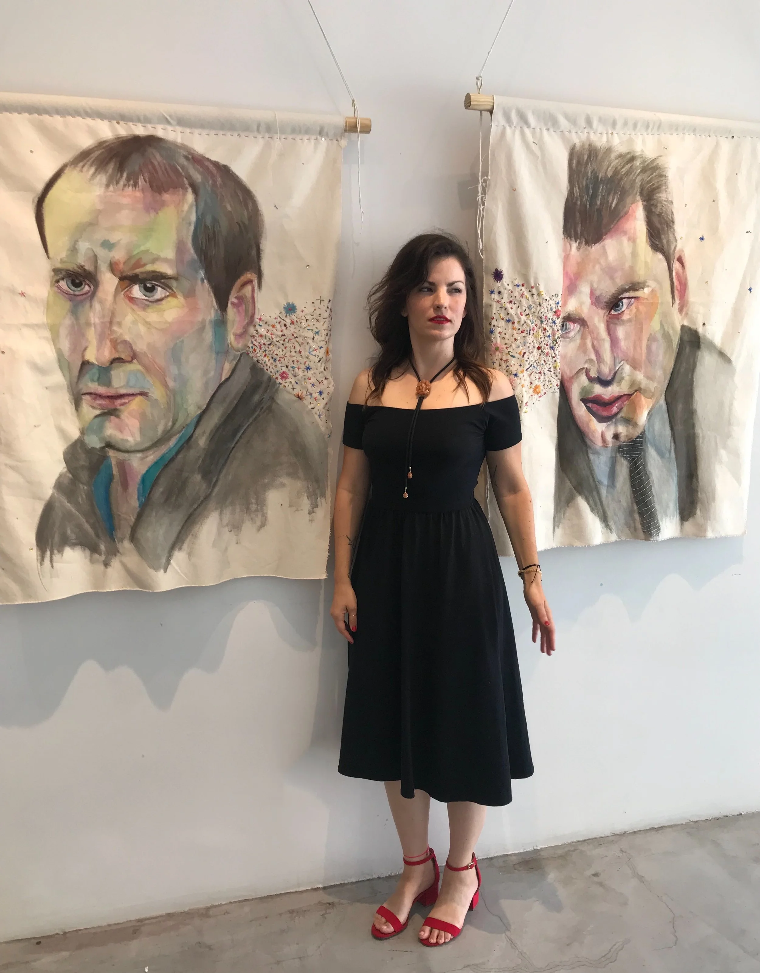 A collection of portraits from the daily painting practice in 2016 & 2017 and a piece made specifically for the show. Castor Troy and Sean Archer (characters from Face Off) with embroidered flowers representing their undeniable connection.