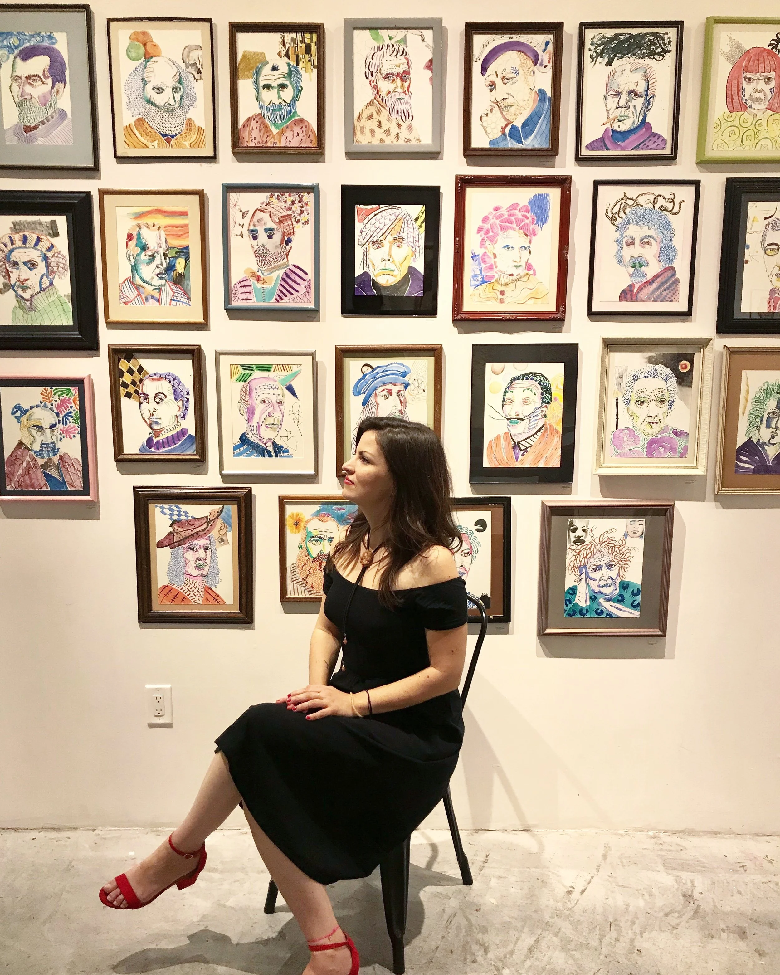 After college, life pulled her away from her practice. In 2015, she found her way back through discipline and play, committing to a drawing a day for a year, then a painting a day for two more. Those three years took her practice to Italy, to airport terminals, and on more than a few bad dates she escaped early to go paint a panda. The practice changed her life. It led to her first solo portrait show at Makers Mess Gallery in Los Angeles, group exhibition work at Thank You For Asking Gallery, and eventually to teaching watercolor, a role she continues to hold at a local Los Angeles studio, sharing with students the same belief her aunt once gave her: that it only takes practice.